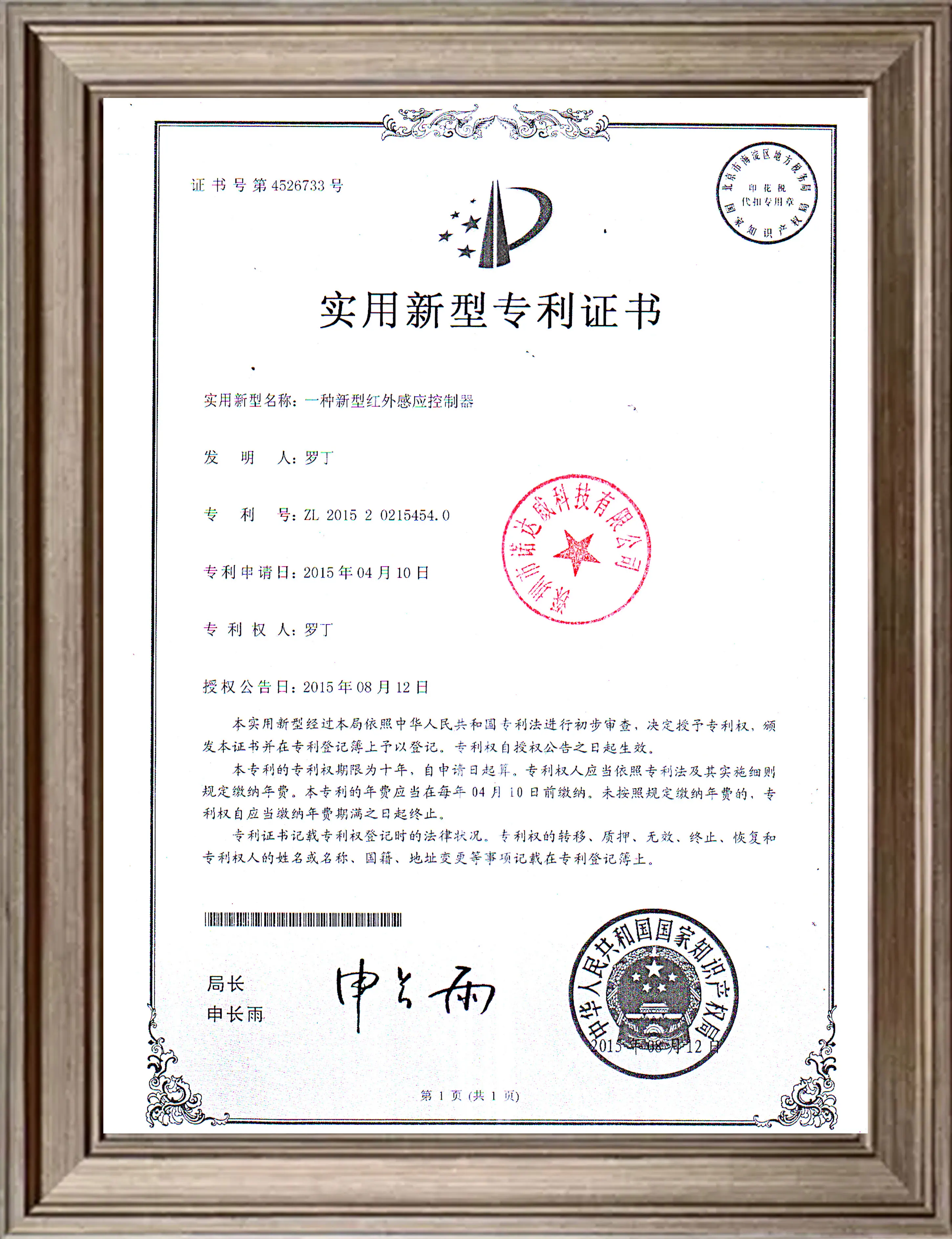 Utility model patent No: ZL 2015 2 02 15454.0