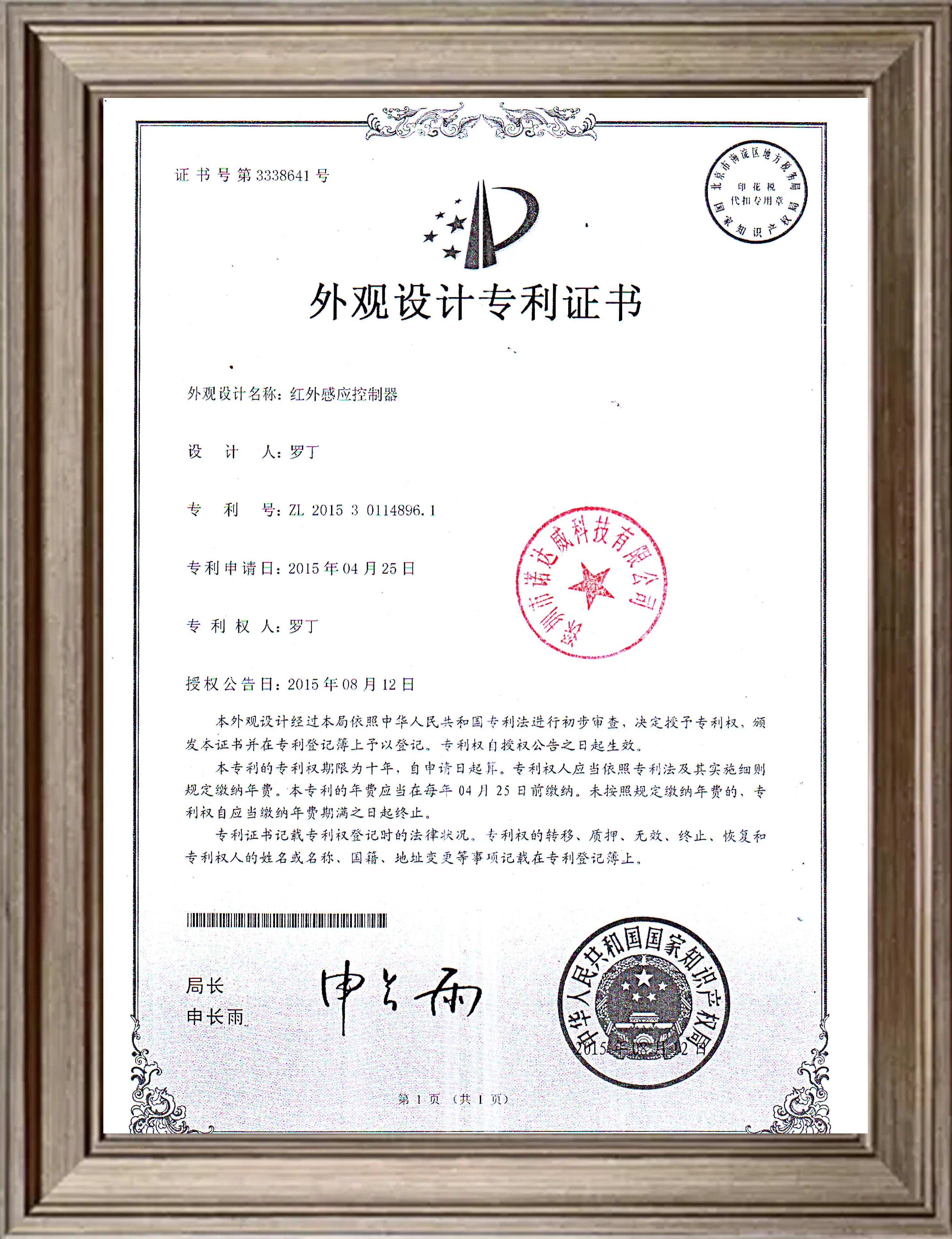 Design patent number: ZL 2015 3 0114896.1